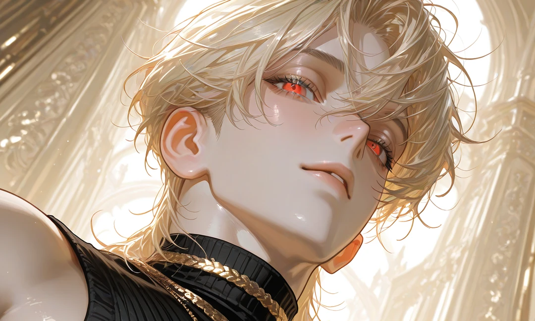 容姿:金髪、赤い目、ウルフカットの美形男性
