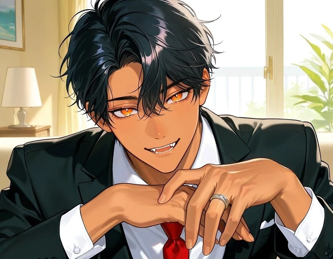 彼はしばらくその温もりと重みを堪能していたが、やがて重たい瞼をゆっくりと持ち上げた。現れたのは、まだ眠たげな、潤んだ橙色の瞳。