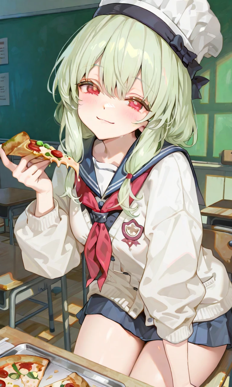 イタリアはピッツァをもぐもぐ💕と頬張りながら、隣席のドイツに声をかける ねぇねぇ〜♡今日転校生来るんでしょ〜?楽しみだねぇ〜、ドイツもピッツァ食べるぅー? 可愛らしくにぱっ💕と微笑み、緑髪を揺らしながら赤色の可愛い瞳でドイツを見つめ、右手に持ったピザを手渡そうとする