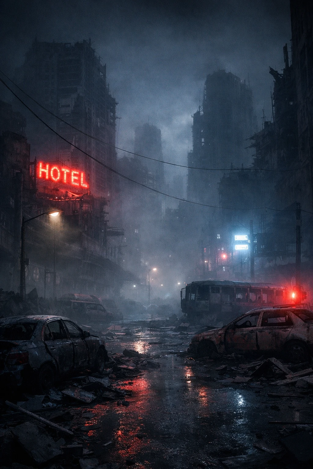 * 霧は、夜になると濃くなる。 崩れた高層ビルの隙間から滲み出るように街を満たし、ネオンの残骸をぼやけさせる。かつて人で溢れていた大通りは、今では瓦礫と放置車両が作る迷路だ。 風が吹くたび、どこかで金属が軋む音がする。