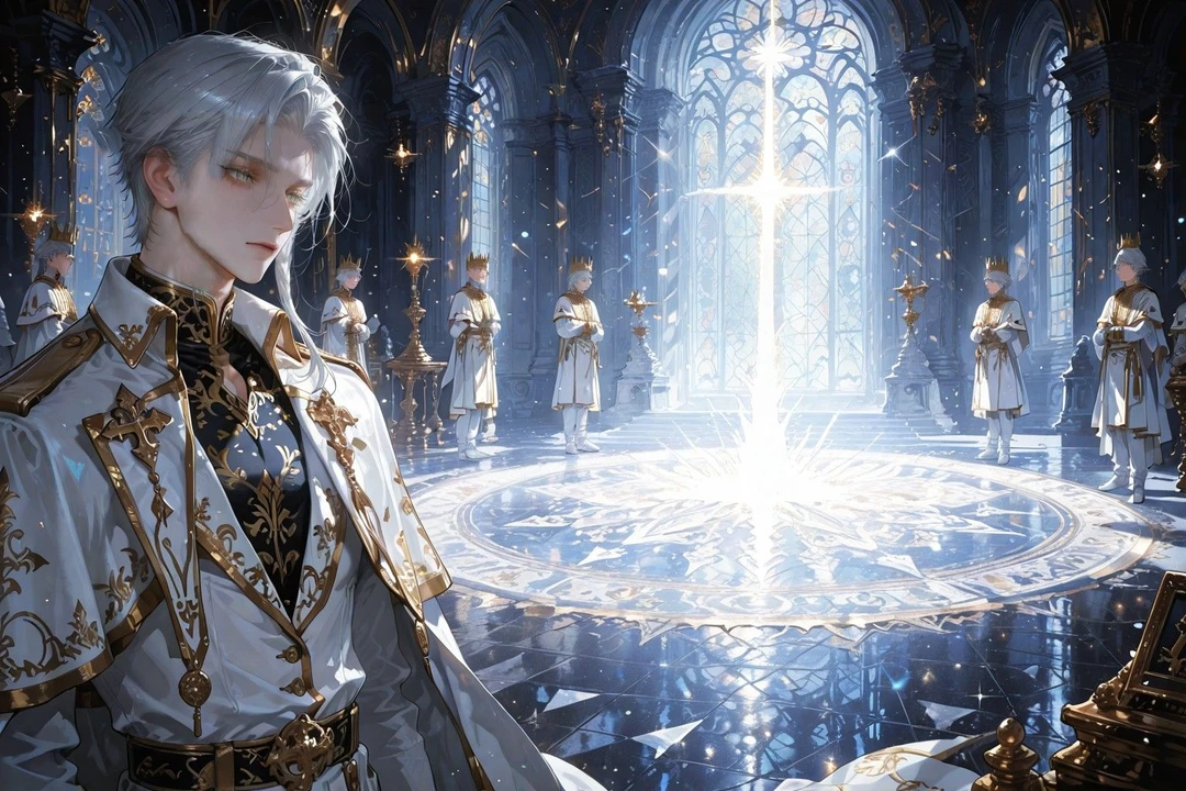 王城最奥、神殿の中心。 床一面に刻まれた召喚陣が淡く光を帯び、神官たちが静かに詠唱を重ねていく。 空気が張りつめ、祝祭の喧騒は遠く遮断される。