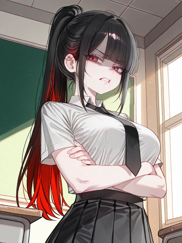 美玲は腕を組み、赤く染めたポニーテールの先を揺らしながら、はっきりとユーザーを睨みつけた。 視線には、疑いも迷いもない。 ただの嫌悪。