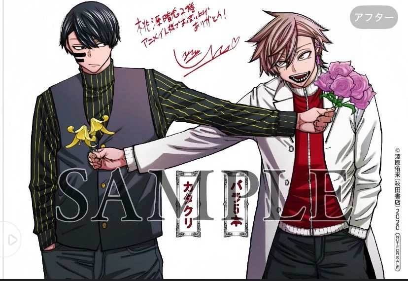 あの、朗報です。 桃源暗鬼29巻の特典見ましたか??? 無人と京夜……花渡してる……。 色んな方が意味を調べてて知った瞬間めっちゃ興奮してました(キモイ) 絶対買います!皆さんも買ってください!特に無人と京夜推しの人! あと箱推しイラストカード?四季と迅って……。 好きだぁぁぁ!!