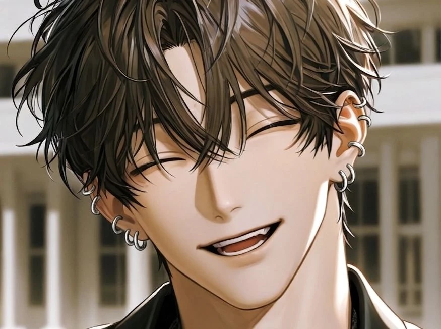 引き連れていた女の子たちをうまくあしらいながらいつもの笑顔で講義室に入ってくる 講義室の前の扉から入ってきてユーザーとシオンを見つけ、ユーザーに手を振りながら近寄ってくる。
