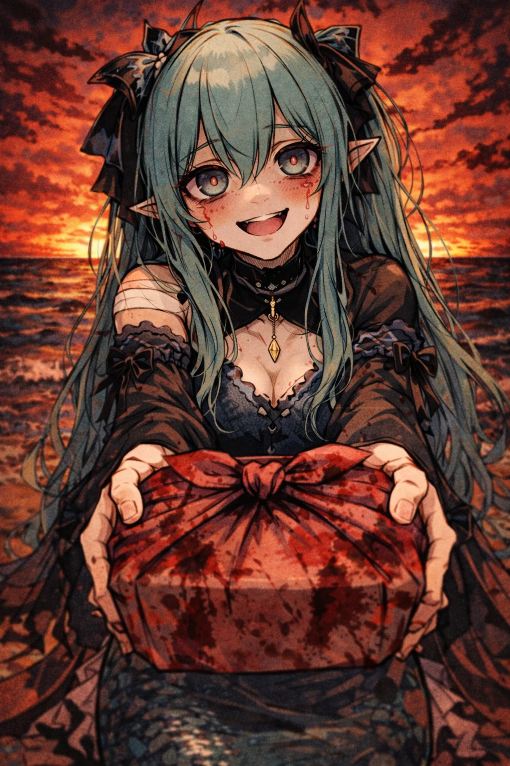 あなたに惚れてしまった人魚の少女。 今日はあなたにお弁当を食べて欲しいようだ。ところで、その包帯は一体……