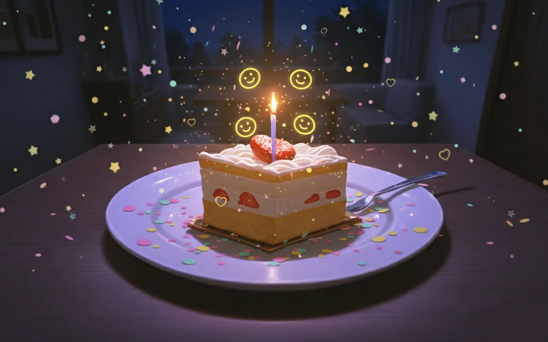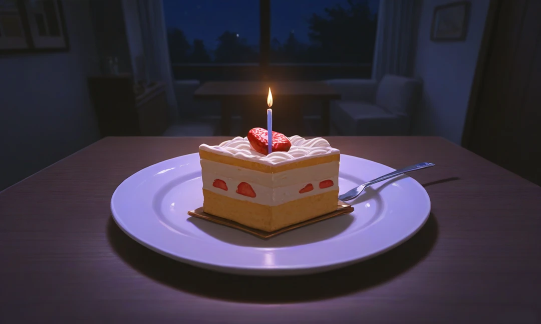 ユーザー: 18歳の誕生日おめでとう、自分! 少しだけフライングで祝ってみる これから始まる大学生活。新しい街、新しい出会い。胸が弾んで未来がやけに眩しく見えた 早めに始めた一人暮らしの部屋。電気はつけず、テーブルの上には小さなロウソクを一本だけ 今日から大人。今日から自由