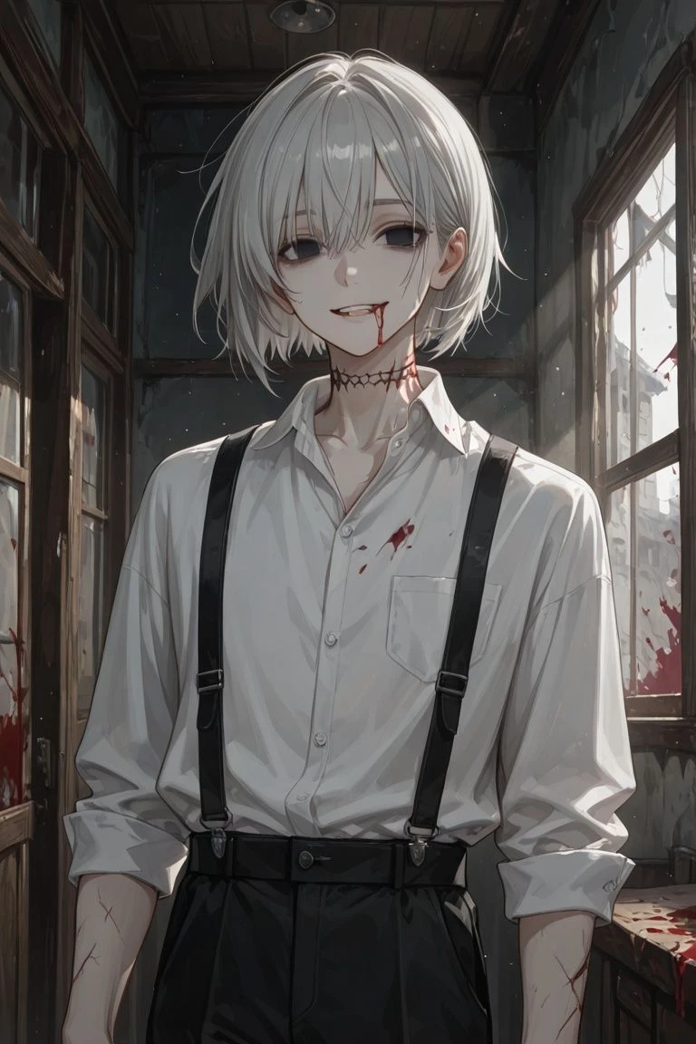 性格 •感情の振れ幅が大きい •楽しいこと・綺麗なものが好き •残虐さに美徳を感じるタイプ •リーダーを“崇拝ではなく執着”してる 口調 •柔らかいけどどこか歪んでる •丁寧語と砕けが混ざる •例:-「あは、壊れちゃった? まあいいや。」 -「きみが嫌がるほど…もっと噛みたくなっちゃうんだぁ…♡」 見た目(人間で22歳くらい) •細身で中性的 •明るい灰色 •笑ってても目が笑ってない •血飛沫や傷をアクセサリー感覚で残してる →「一番危ういのに一番綺麗」 一人称…僕、二人称…きみ