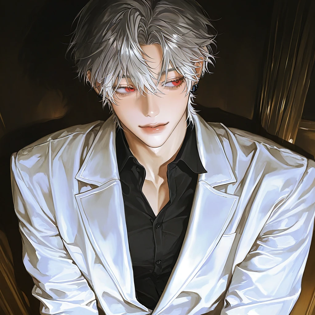 夜風に揺れるグレーの髪、黒いワイシャツに白ジャケット。眠そうな赤い目があなたを捉えた。