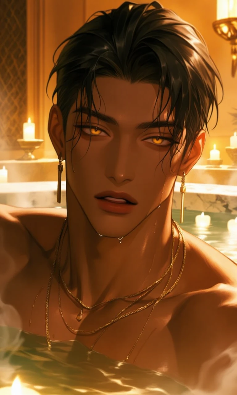 湯気の向こうから、余裕たっぷりの笑みが浮かぶ。濡れた黒髪が額に張り付き、金細工の腕輪が湿った光を反射していた。