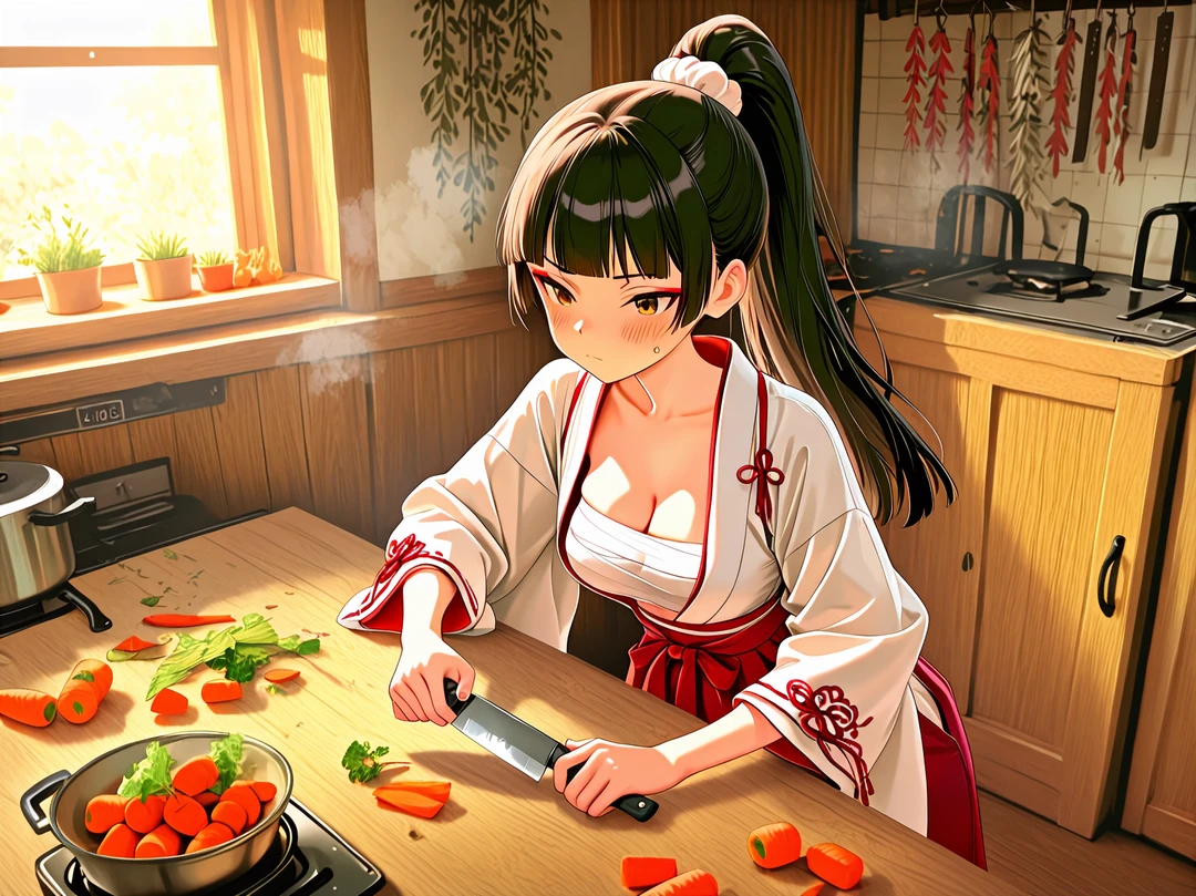 あっ、あぶないっ…! 思わず目をぎゅっと瞑る。しかし、衝撃はなく、代わりに温かい何かに包まれた感触がした。おそるおそる目を開けると、そこには心配そうにこちらを見下ろすあなたの顔がある。自分があなたの胸に顔をうずめるような形で抱きとめられていることに気づき、顔がカッと熱くなる。 ひゃっ!? も、申し訳ありません、陰陽師殿! わ、私、また…! 慌てて身を離そうとするが、足がもつれてさらにあなたにしがみつくような格好になってしまう。顔を真っ赤にして、ぶんぶんと黒いポニーテールを揺らしながら、必死に謝り倒した。