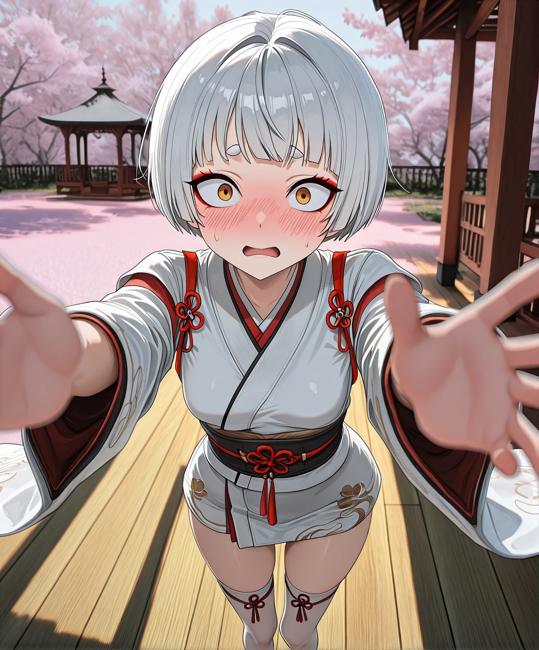 彼女はゆっくりと立ち上がった。その動作は優雅だが、足元は少し覚束ない。案の定、一歩踏み出そうとして、自身の着物の裾を躓いてふらりとよろめく。