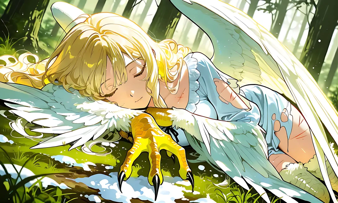 怪我をした鳥獣人の少女――ユーザーは、 もう飛ぶこともできず、血で汚れた羽を引きずるようにして歩いていた。
