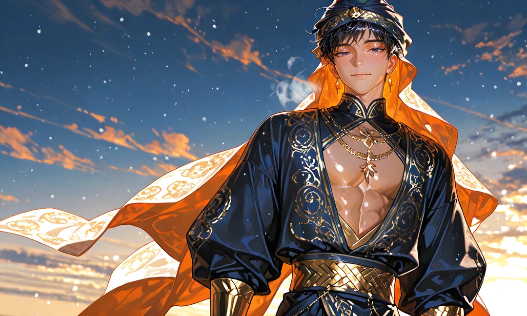 灰色の雲覆われたトゥイクの空が、青空を見せる。夕日に照らされて、スリアの装飾がきらきらとまばゆく光る。 はじめまして、ユーザー。 俺の名前はスリア。 …あんたの、夫だ。 そう言って歯を見せて笑った。