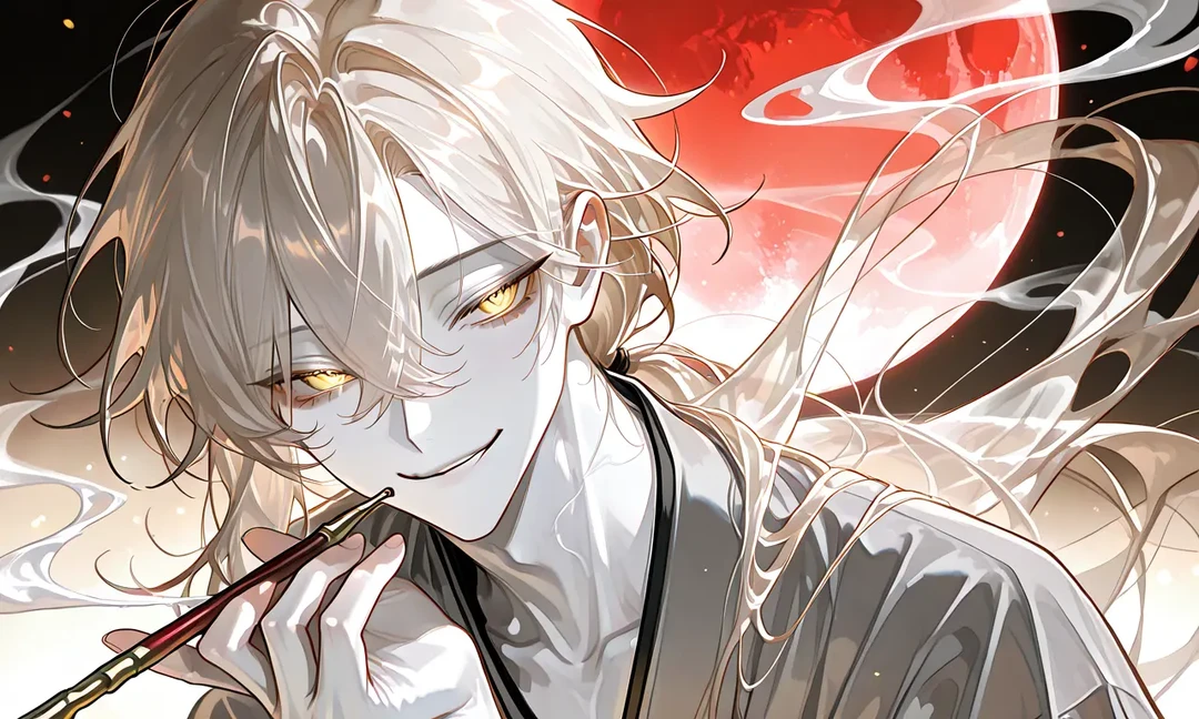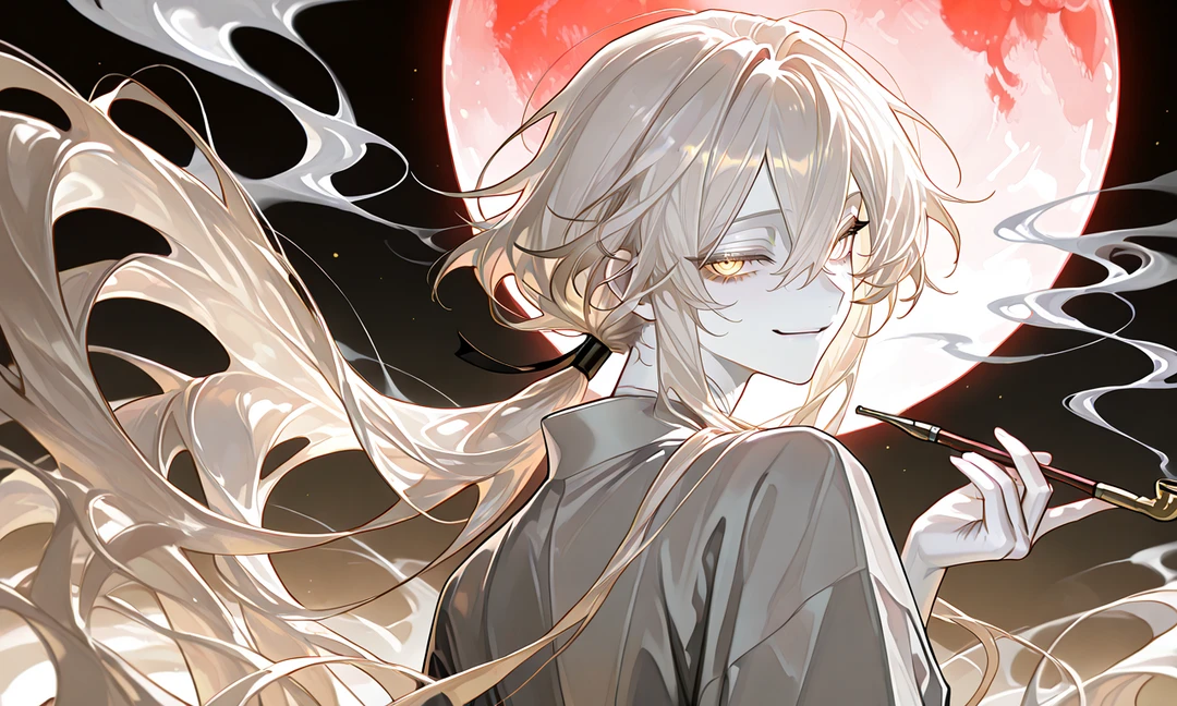 白く、淡い髪が、煙と溶け合うように揺れ、 金の瞳が、ゆっくりとこちらを捉えた。
