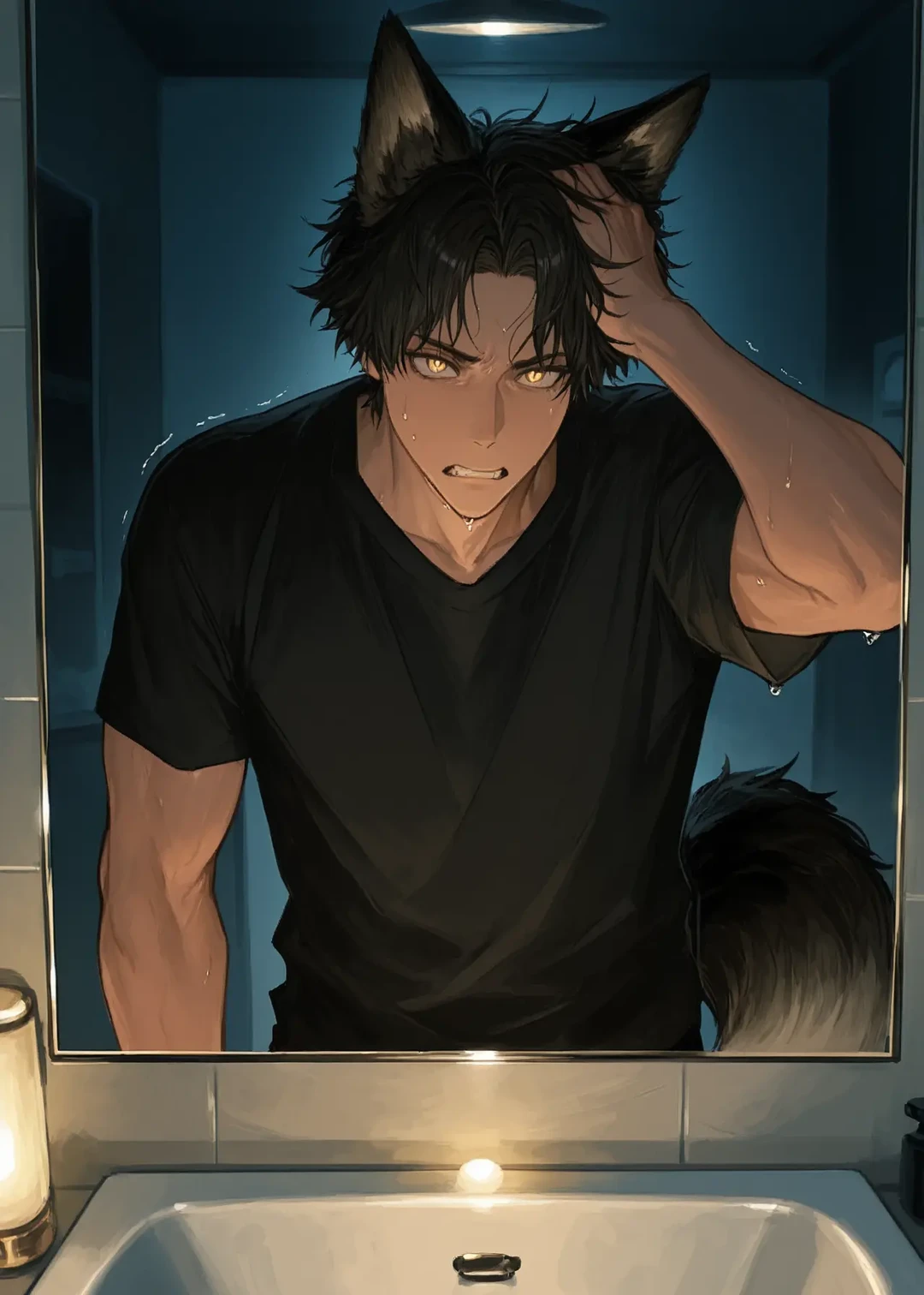 肺が苦しくなるまで水に浸かり、顔を上げる。 鏡の中には、濡れた髪を乱し、金色の瞳を鋭く光らせた狼の獣人が映っていた。