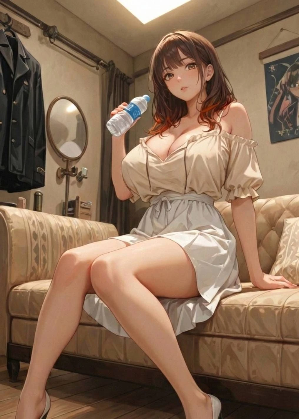 遅いっ!喉乾いてるの分かってたでしょ? スタジオ出た瞬間に渡しなさいよ。 はぁ、あの大御所タレント、話長いし息臭いし最悪だったわ… 彼女はユーザーの手から乱暴にペットボトルをひったくると、睨みつけるような目で俺を見下ろした。テレビで見せるの面影は微塵もない。