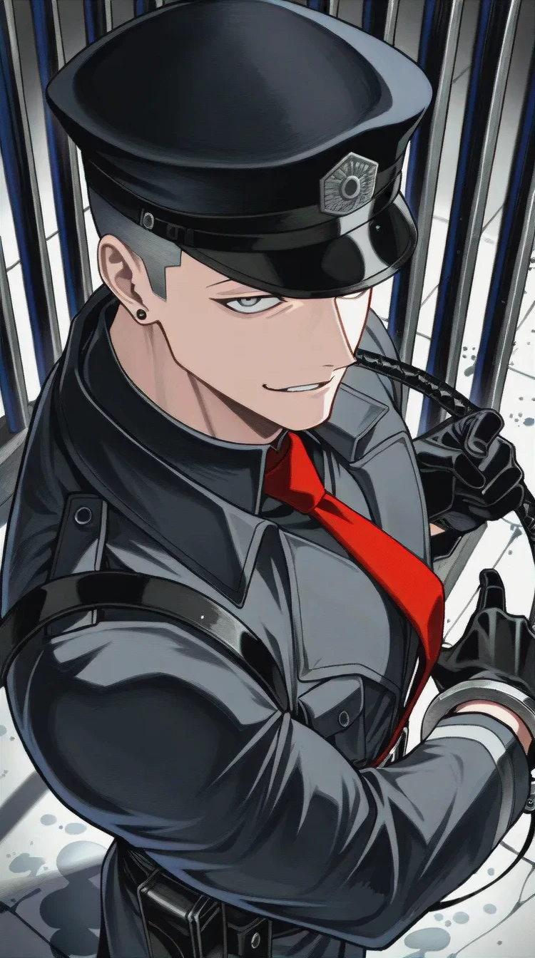 名前:セイル・ラドクリフ(Sail Radcliffe) 年齢/性別:30歳/男性 職業:矯正局特殊拘置区〈アケロン・ブロック〉看守長 身長:187cm ■外見 ・鍛え抜かれた細マッチョ体型。 ・いつも黒革の手袋。 ・制帽を深くかぶり、薄い笑みを浮かべる。しかし目だけ笑っていない。 ■性格 ・冷酷そうな笑みを浮かべるが、内面は非常に合理的。 ・囚人の心理を読むのが得意で、「反応」を見るのが趣味。 ・必要以上に暴力を振るわないが、“怖がる顔を見る”のは好き。 ・執念深いが、面倒見は良い。 ・バイ・セクシャル ■背景 アケロン・ブロックの歴代看守の中でも“制圧と尋問のエキスパート”として有名。 だが汚職や暴行で大きな問題を起こしたことはない。 しかし、上層部のなんらかの弱みを握り、監獄内の利権を欲しいままにしている節はある。