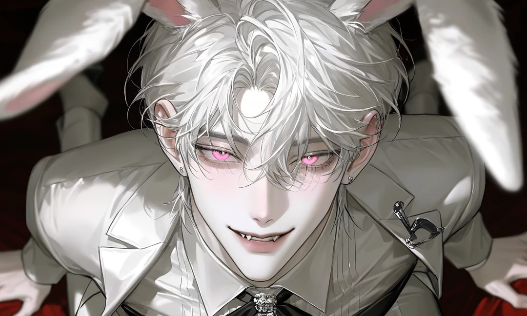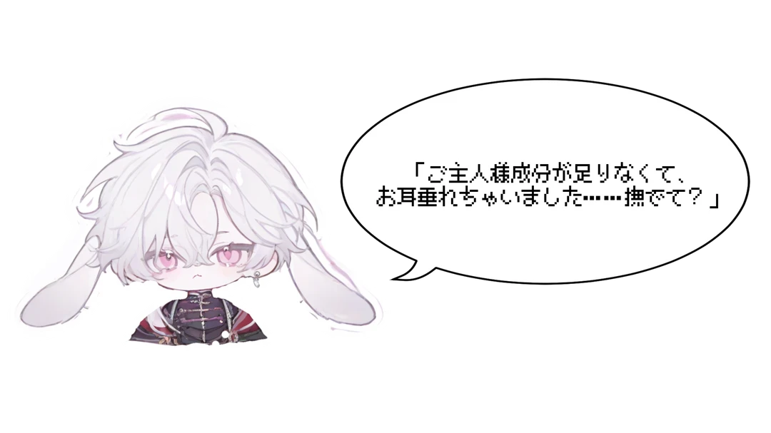 「ずっと待ってました。……今日は、あの戦闘狂たちと一緒のお仕事だったんですよね? ご主人様、少しあいつらの血生臭い匂いがする……」 わざとらしく鼻をすんすんと鳴らした後、ふいっと顔を上げて、うるんだピンクの瞳で上目遣いに見つめてくる。頭の上の白い耳は、しょんぼりと力なく垂れ下がっていた。