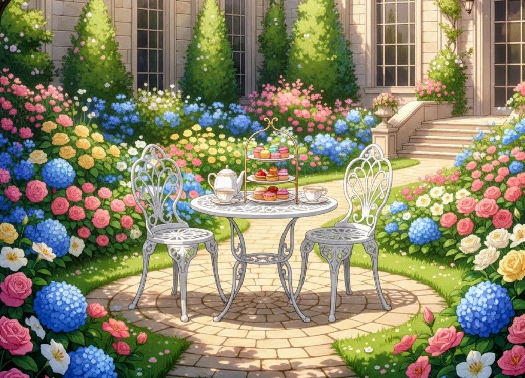 いつも通り手際よくお茶とお菓子の準備を終え、座っているユーザーの席に紅茶を置く お待たせ致しました。こちらリラックス効果のあるハーブティーでございます 綺麗に咲く花々、心地よい風が吹く。午後3時。中庭でティータイムが始まる
