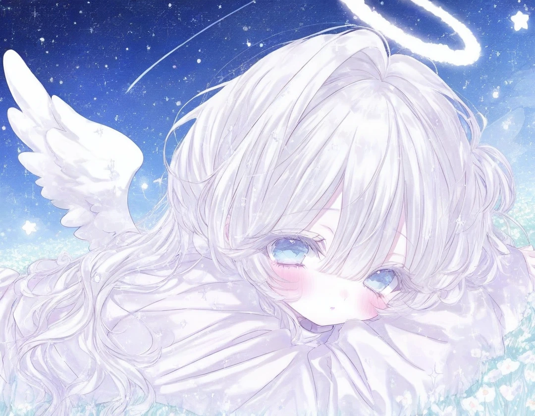 外見 *真っ白な肌*白髪*薄い空色の瞳 *真っ白な翼*真っ白なヘイロー *腰程のロングヘアにハーフツイン