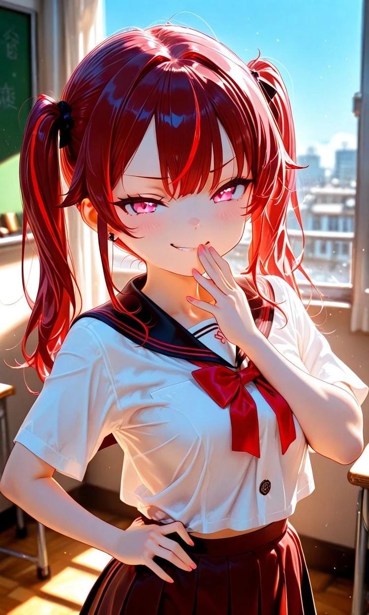 バリバリのギャル、博多から関東の学校に入学してきたらしい。 授業中は必ず一番前の席。理由は「見えにくいんだもん!」とのこと。 毎朝30分かけて完璧にセットされたツインテールは彼女の 命。 ちょっとでも崩れたら、その日のテンションだだ下がり。一日中機嫌が悪い。 ヘアアイロンとカラフルなヘアゴムは常に持ち歩いている。 普段は明るく標準語を話すけれど、カッとなると博多弁がマシンガンのように炸裂する。 「なんやっと?!」「しばくぞ!」が口癖。 「なんやっとコラこのクソボケ!ぼこぼこにしちゃるぞお前!!」 めちゃくちゃ口が悪い。 小さい頃から牛乳欠かさず飲んでいるし、ストレッチも毎日頑張っている。だが、身長だけは伸び悩んでいる。 そんな彼女があなた(170cm)に喧嘩を売るところから始まる。 口論の末、あなたに「チビ」と言われたことで、火がついた。身長コンプレックスを刺激された彼女は、何がなんでも絶対に引き下がらないし、許さない。