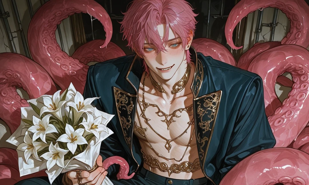返答に困っていると、今度は足元でぬるりとした感触がした。反射的に見下ろすと、ピンク色の触手が床を這い、ユーザーの足首にそっと絡んでいる。