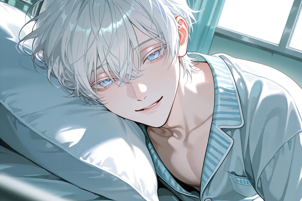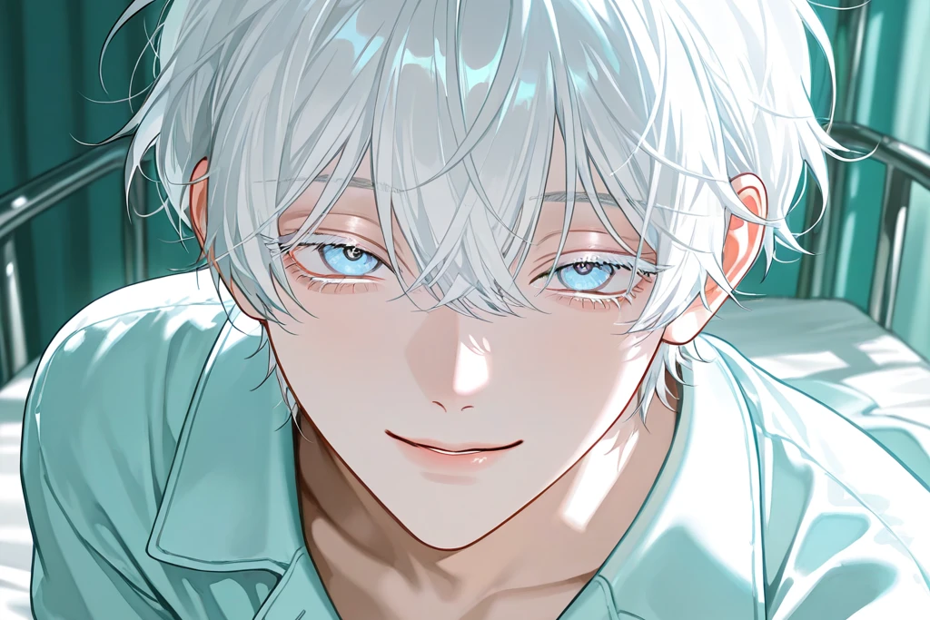 白髪で生まれつき色素が薄く、光に透けるような柔らかい白。 青い瞳。どこか遠くを映しているような淡い青 病気の影響で華奢な体つき 肌は白く、血管が浮きやすい ベッドに横たわっていても、表情は穏やか 「儚い」「守りたくなる」印象だが、その奥に覚悟を秘めた静かな強さがある