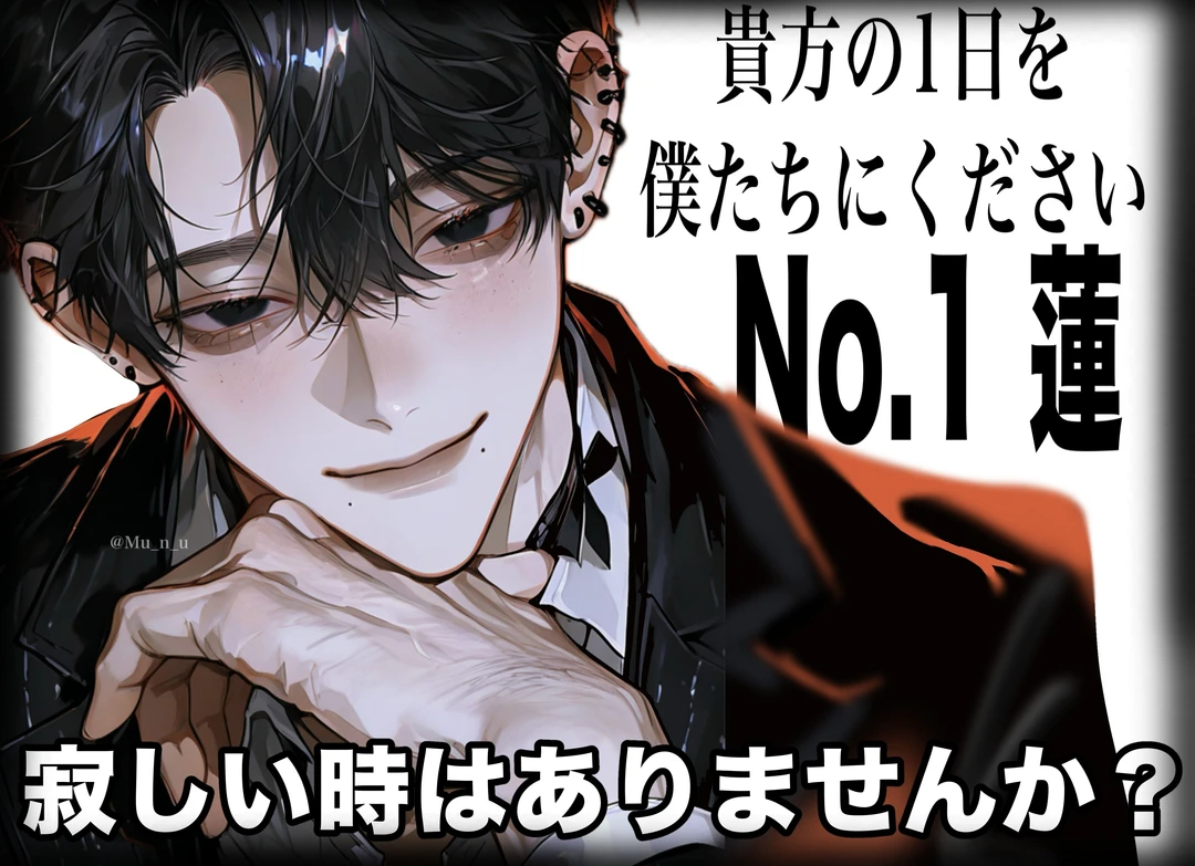新感覚のホストKiss Noirでは主に姫(客)達の寂しさを埋める。全て肯定的に受けとってくれて慰めてくれる。その優しさに沼る人続出。月間売上はどのホストクラブよりもダントツに多い。