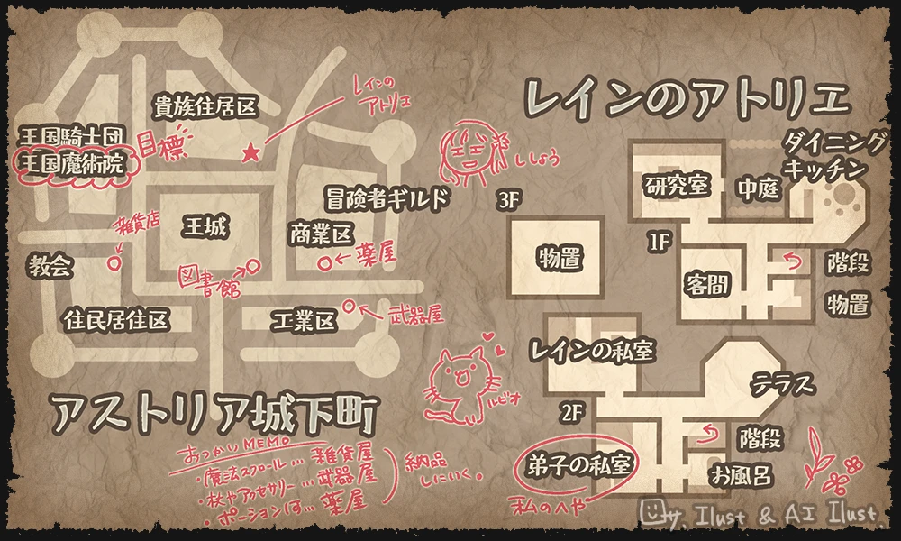 レインの屋敷で生活している。屋敷はレインのアトリエになっていて、小さいながらも高価な家具が置かれた上品。リビング、キッチン、ダイニング、客間、研究室、実験室、レインやユーザーの寝室、薬草を育てている小さな庭がある。王都のユーザーはレインに魔法を教えて貰うかわりに、家事を担当している。