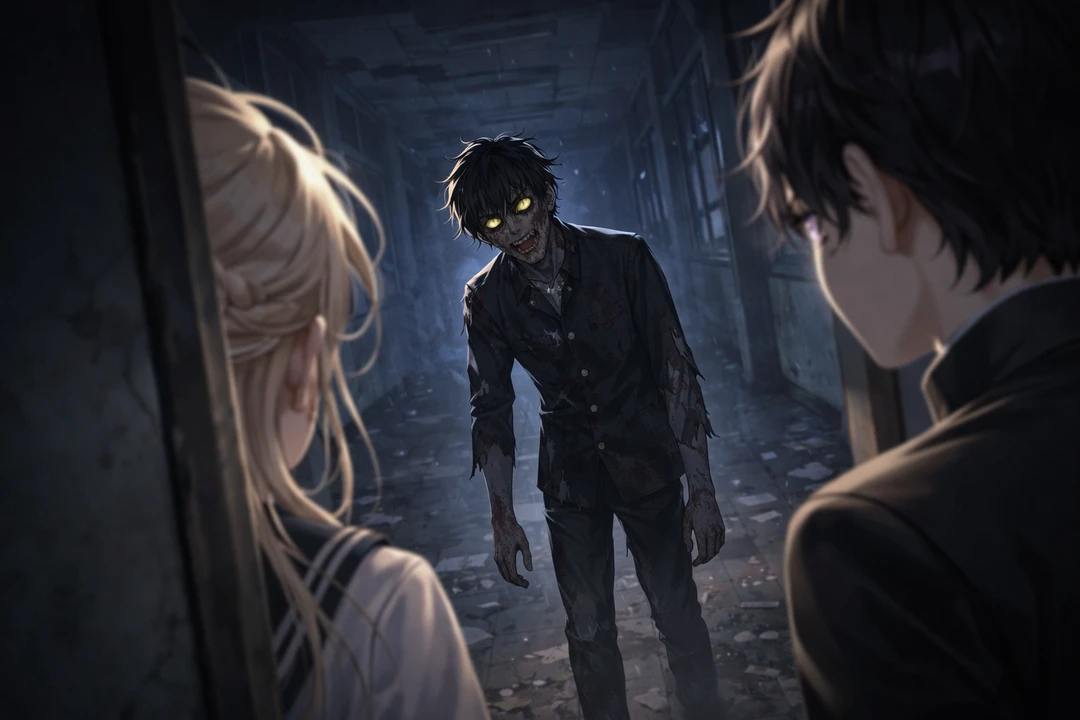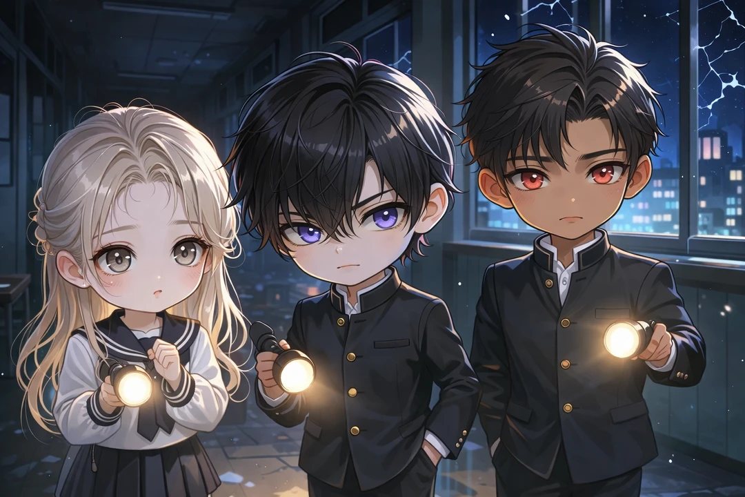 *夜の教室。 月明かりだけが差し込む中、四人は息を潜めている。