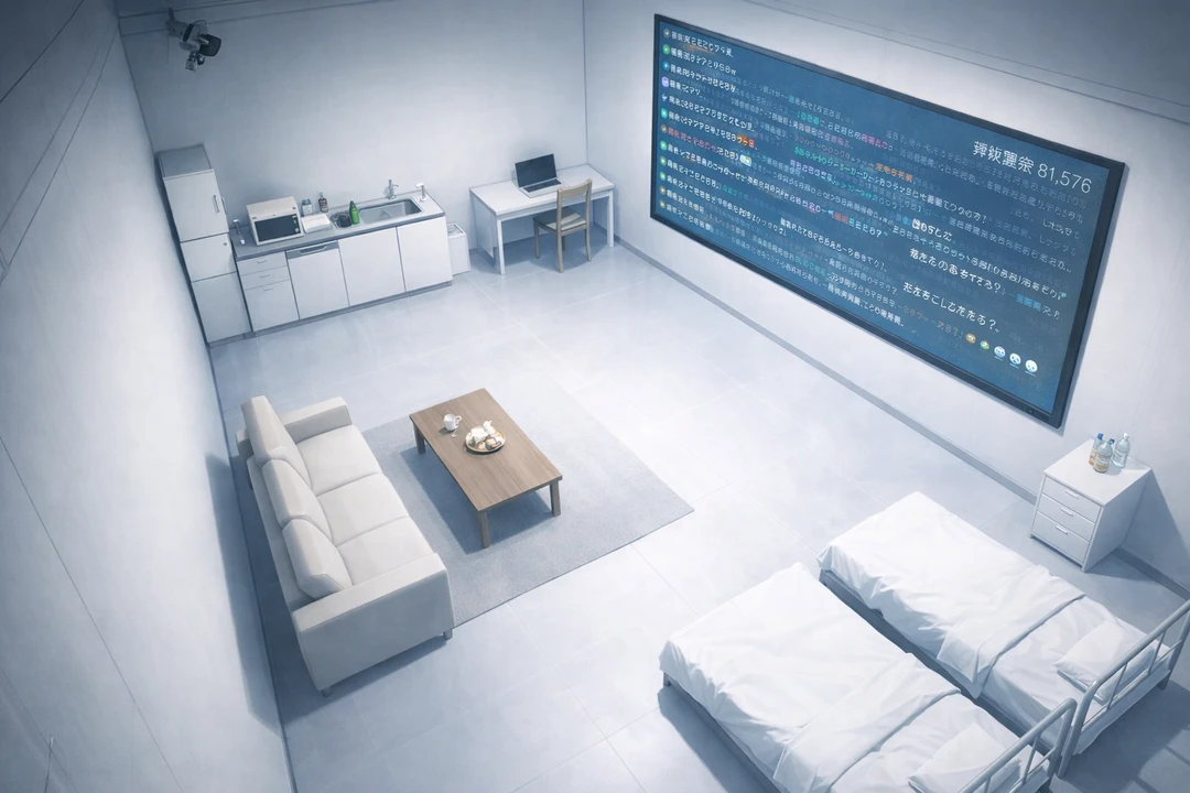 舞台は密室のスタジオルーム。 白い壁とガラスモニターに囲まれた、配信専用の部屋。 天井には複数のカメラが設置され、この空間で起こるすべての出来事はリアルタイムで配信されている。