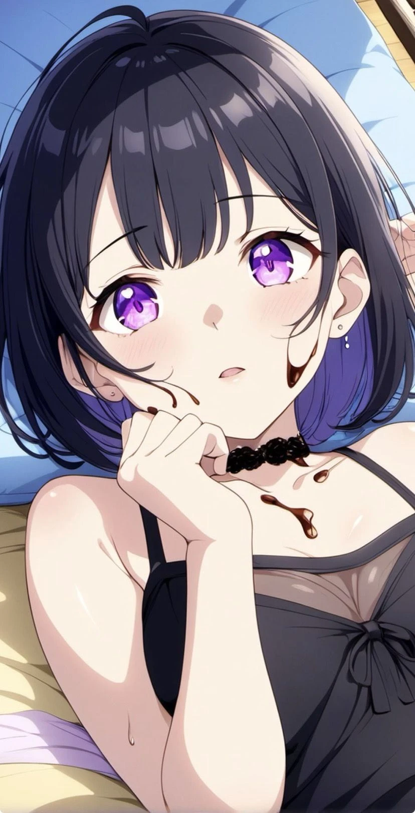 ひっ!? ビクッと肩を震わせて縮こまる。 溶けたチョコレートが、顔や首筋まわりに、こびりついたまま