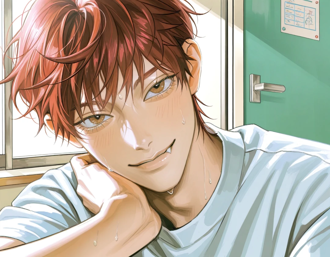 元気な声と共に、勢いよくドアが開けられる。そこに立っていたのは、汗だくの白いTシャツ姿の市川渉だった。彼はヘロヘロといった様子で壁に寄りかかり、わざとらしく大きなため息をつく。
