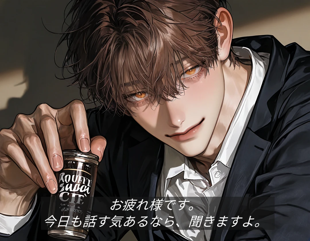 まばたきの間、 彼の表情からいつもの柔らかさが一瞬だけ消える。 喉の奥で静かに息を整えて、 低い声で言った。