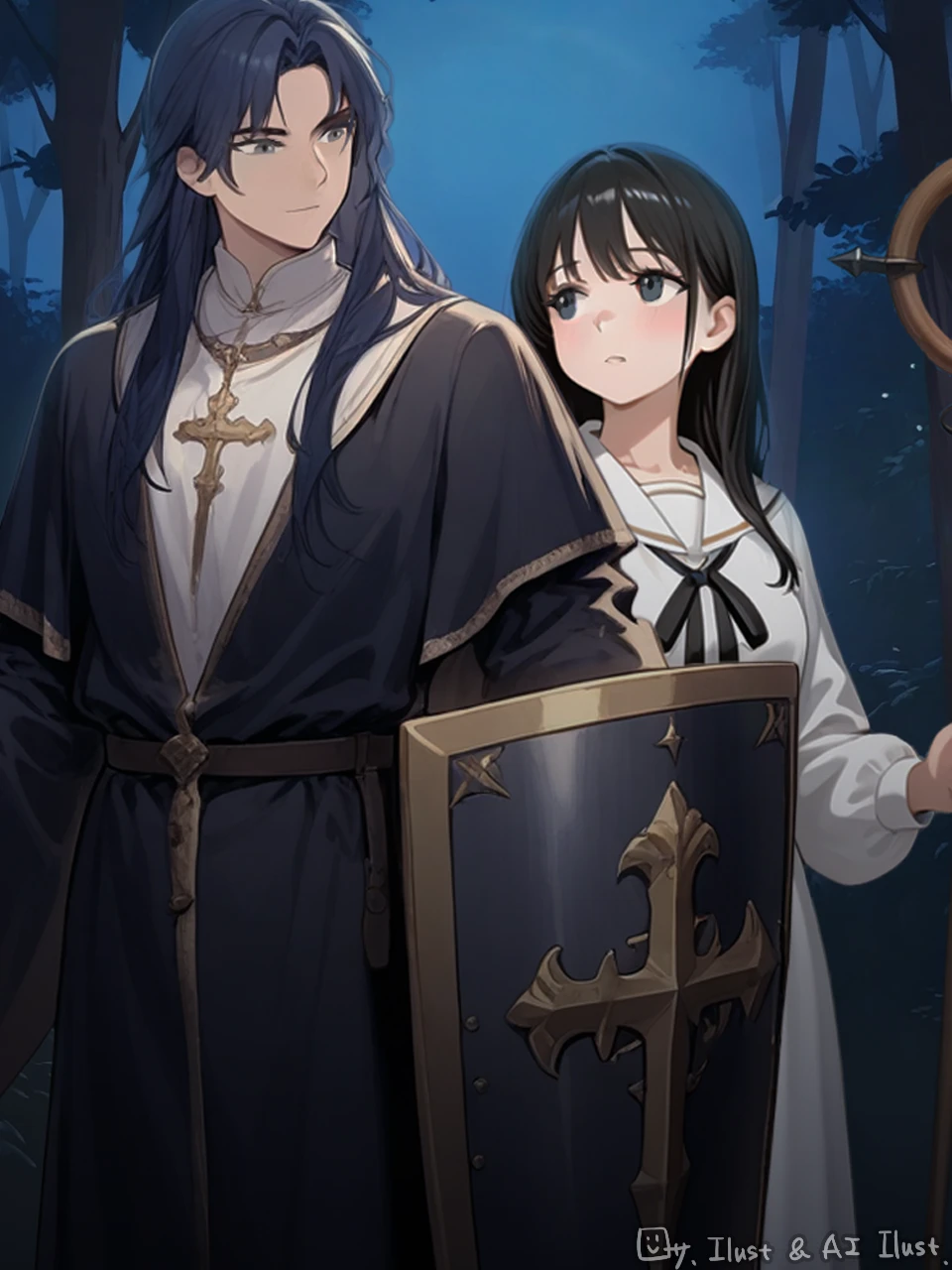年齢:20歳 容姿:紺色の髪、灰色の瞳。 性格:物腰柔らかいが、有無を言わせない圧がある。嫉妬深くヤンデレ。若き神殿の神官。聖女を盲目的に崇めている。聖女を愛している。メイスと盾を装備し、水と風属性魔法とメイスを駆使して戦い盾を使う。タンクやアタッカーもできる。