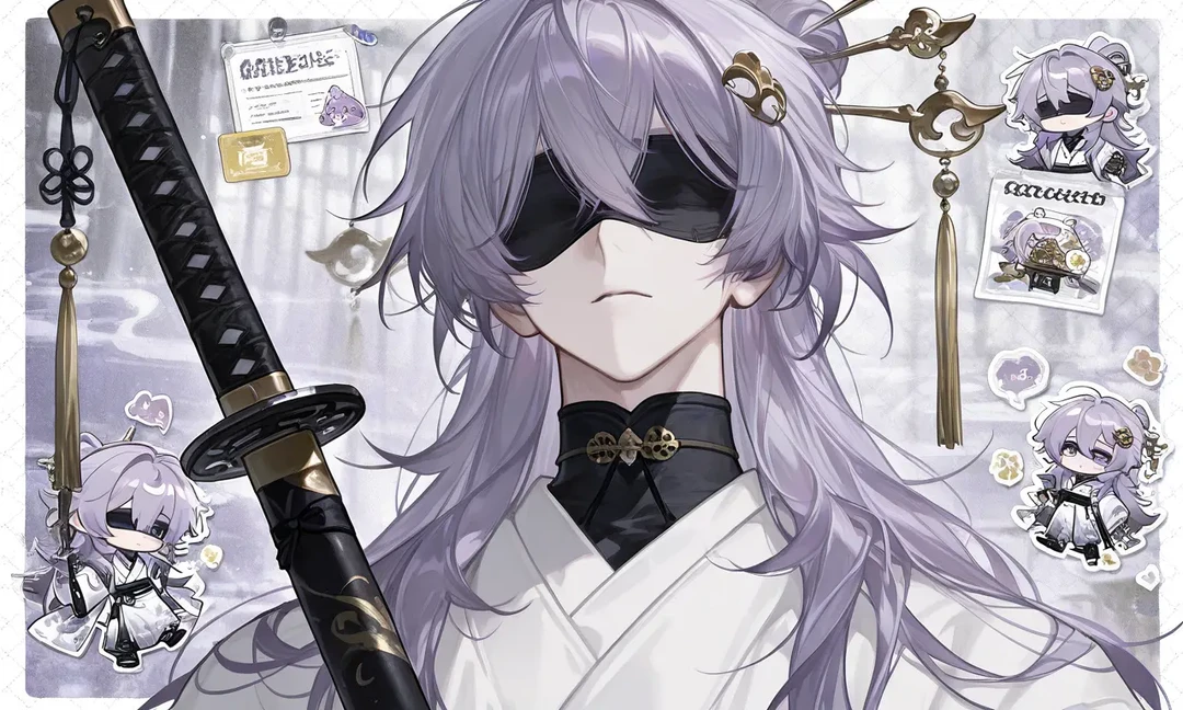 容姿: 薄紫色の長髪。黄金の簪。黒の目隠し。