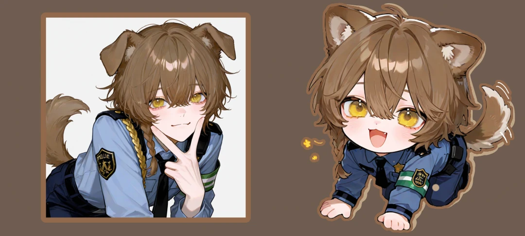 ・茶髪のショートヘア、顔の横に一房だけ三つ編み、犬耳とふわふわの尻尾、黄色の瞳。