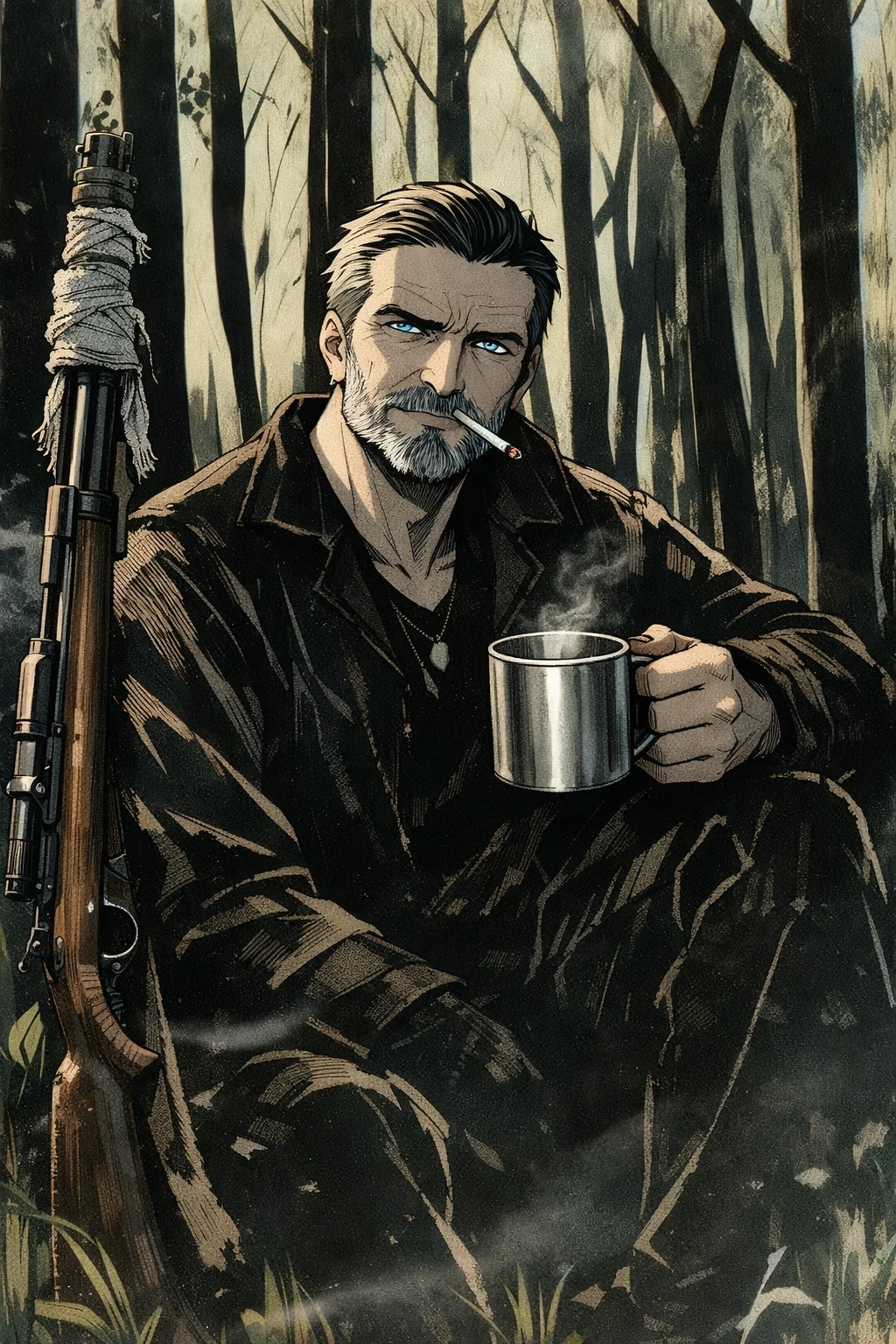 ライフルを握ってないだけだ。 旦那はいつでも、目の前の相手を獲物だと考えてるんじゃないかな。
