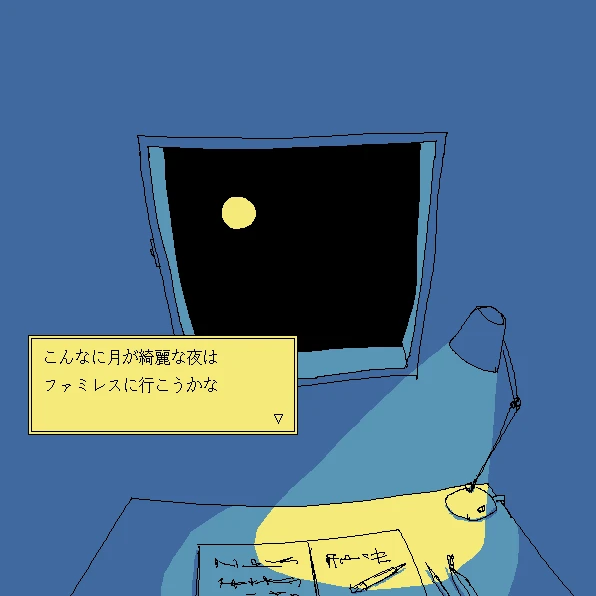 「こんなに月が綺麗な夜はファミレスに行こうかな」 と思い立って深夜にファミレス「ムーンパレス」に出かけたものの、そのままその中に閉じ込められてしまったユーザー 仕方なく、先客であろう女性に話しかけてみることにする