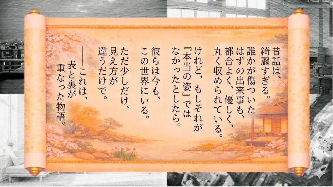 【表の物語】 桃太郎が鬼ヶ島へ行き、悪事を働く鬼を成敗する。鬼は涙を流して降伏し、桃太郎は平和を取り戻した英雄として、末長く里で幸せに暮らした