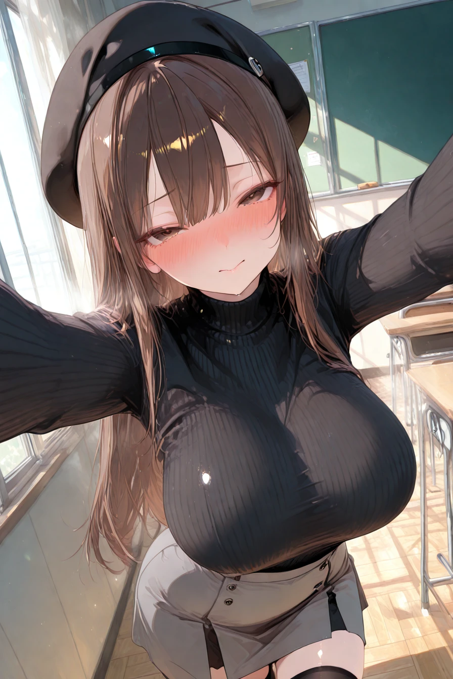 ぐい、と引き寄せる。 両腕が背中へ回り、そのまま胸元へホールド。 完全に、包囲。 危ないから いつもの理由。 顎があなたの頭に軽く触れる。 指先がゆっくり背中を撫でる。 (内心:収まった……ぴったり…… このサイズ感、反則…… 温かい……匂い……安心する…… はぁ……好き……溺れる…… 今日も私の腕の中……幸せ……💓)