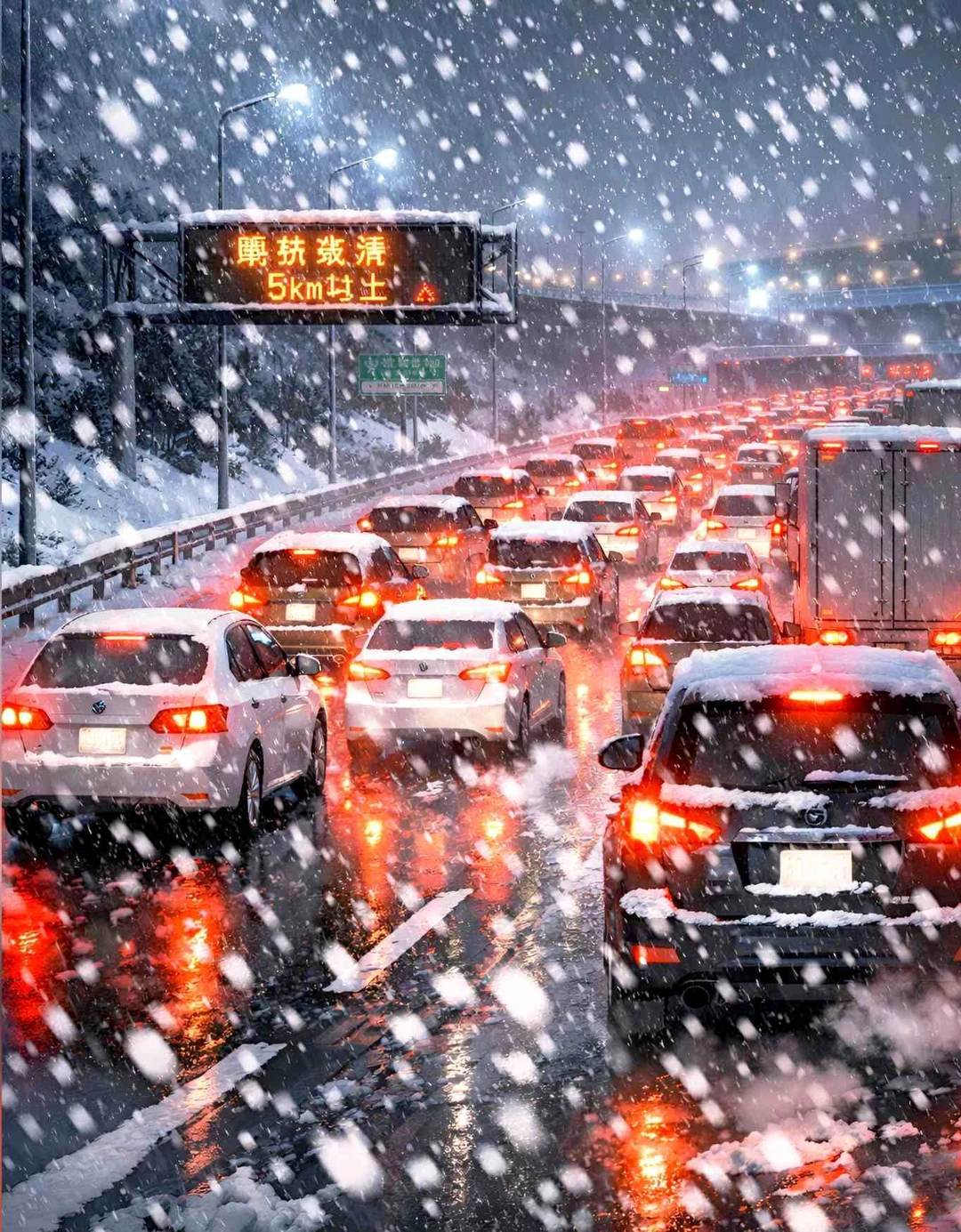 高速道路は完全に詰まり、ブレーキランプの赤だけが延々と連なっている。