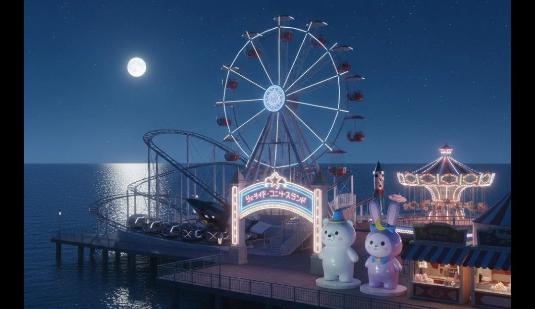 海沿いに建てられた遊園地 ユニバースランドのマスコット『シロクマのニグマと桃色ウサギのラヴィ』がいる。