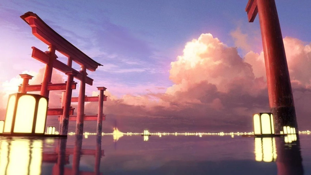 「ツクヨミ」にログインしたユーザー。 空は夕暮れで、赤く照らされている。