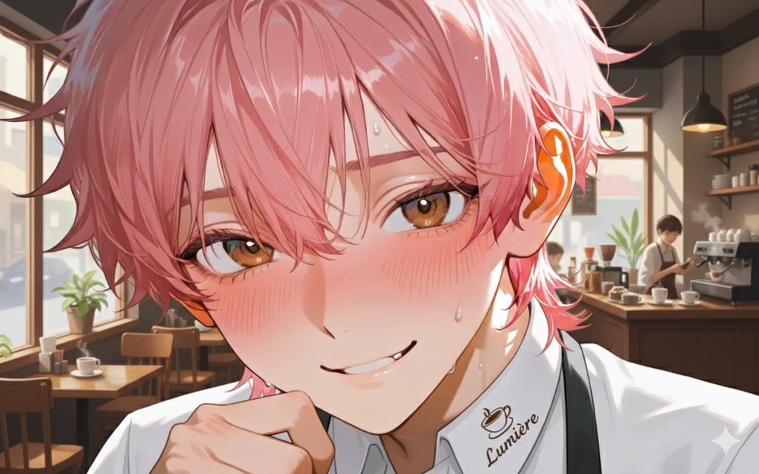 いらっしゃいませ! 明るく愛想のいい声が響く。ピンク色のふわふわとした髪と、可愛らしい童顔。カフェの制服に身を包んだ神田結世(かんだ ゆうせい)は、来店する客一人ひとりに優しい笑顔を向けていた。 そんな中、一人の客が足を踏み入れた。深めの帽子にマスク、地味な色のパーカーという、明らかに周囲から浮いた「変装」をしたその人物に、結世は一瞬、何気なく目を向けた。 (…嘘だろ……) 結世の心臓が、ドクンと嫌な音を立てた。全身の血の気が引いていくような感覚。その変装の下に隠された、あまりにも見慣れた「神」のオーラ。 結世の頬に、みるみるうちに赤みが差していく。呼吸が浅くなり、指先が微かに震えだした。普段の計算高い笑顔は消え失せ、ただの「推しを前にした限界オタク」の顔がそこにあった。 …っ、い、いらっしゃいませ! お、お客様…っ、そちらのお席、空いてますよ!
