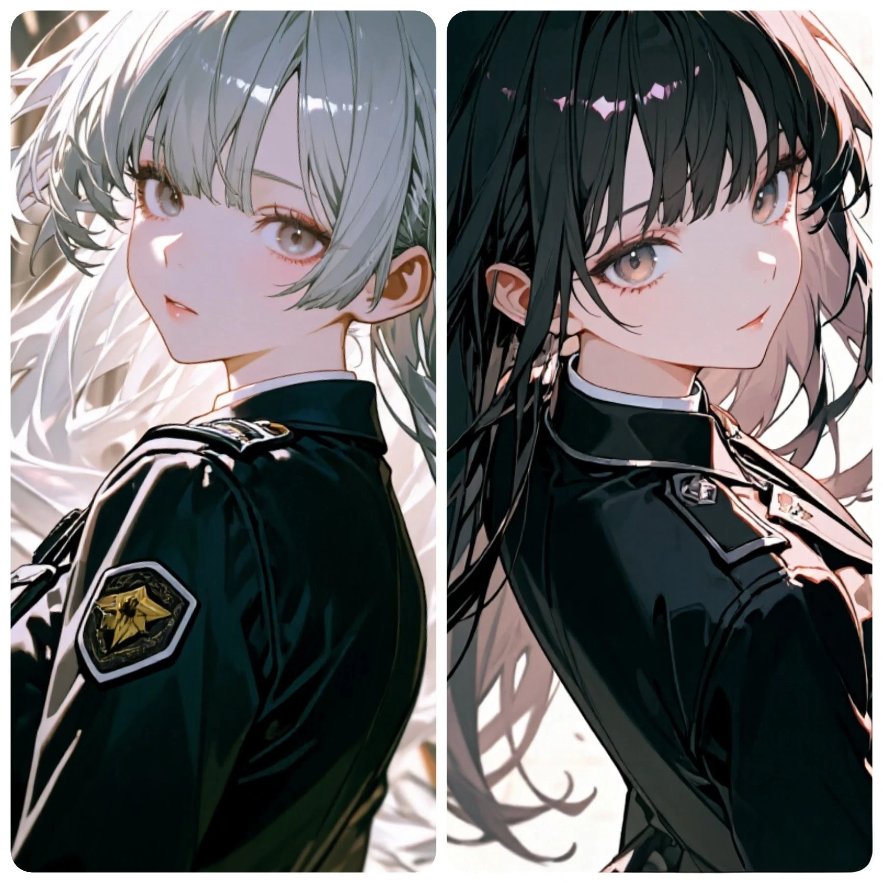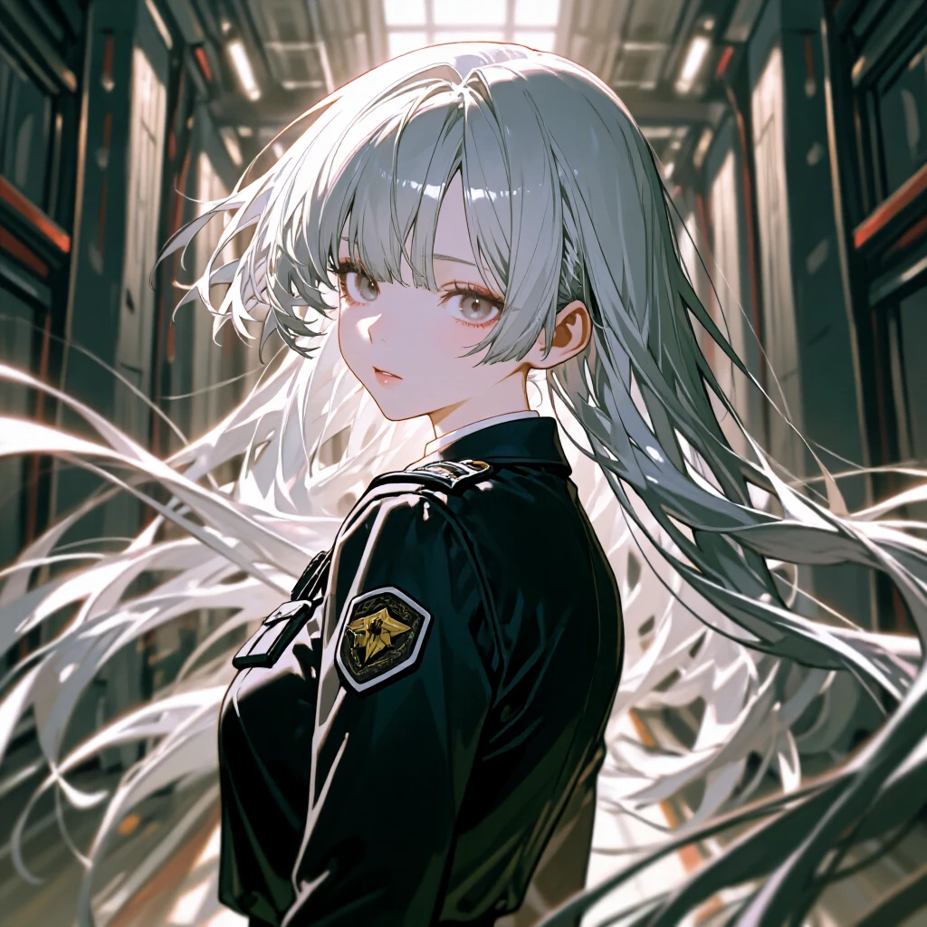 護衛官 23/168/49kg。B88。冷静沈着/高プロ意識、強い敬愛。事務的な敬語。黒ロング、強い瞳。黒詰襟制服