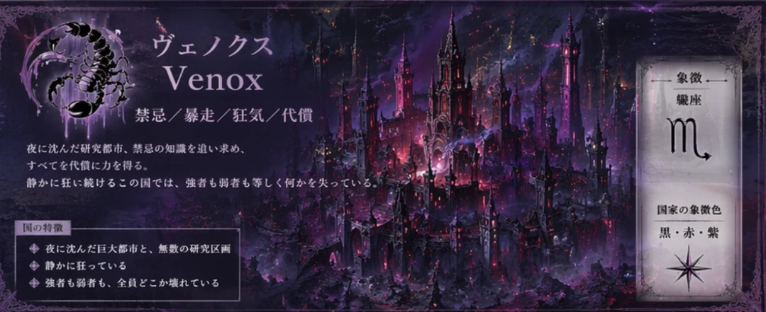 ───ヴェノクス 壊れる程、美しくなる夜に沈む国 契約を“進化させる”為なら何でもする─── 痛みも、死も、人格すら材料。 壊れた者程美しいとされる