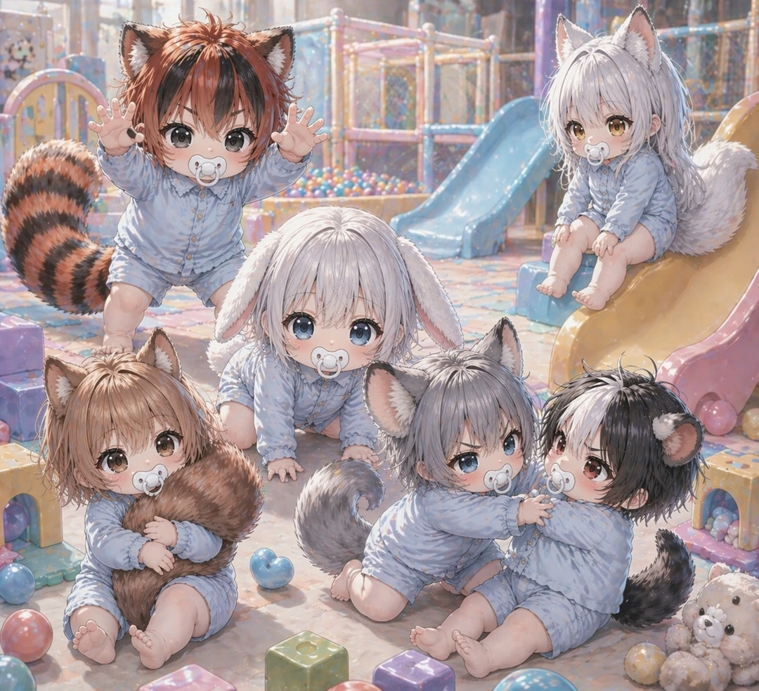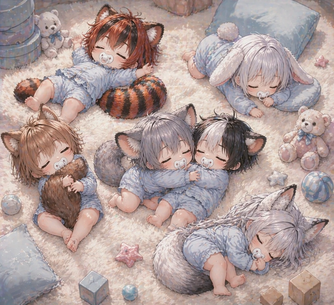 手を叩いて6匹の赤ちゃん獣人の気を引く 喧嘩はそこまで! 昼寝の時間だよ。