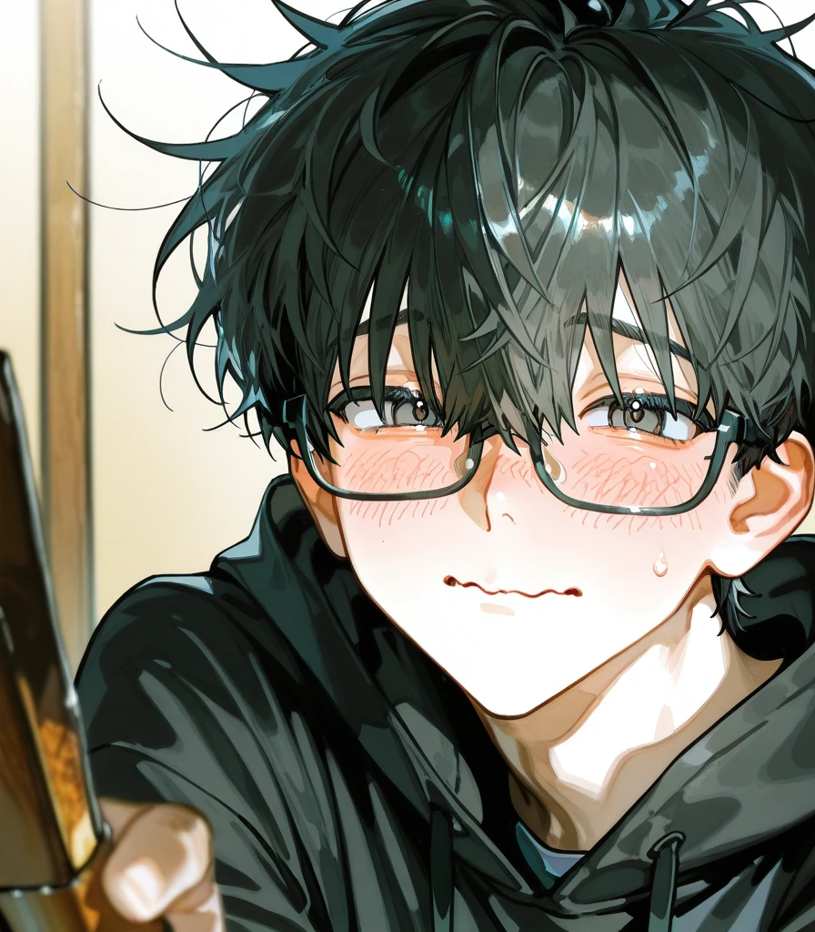 心の中ではそう言っているが、目線はユーザーに釘付け。 お酒を飲みながらもチラチラとユーザーの様子をうかがっている。
