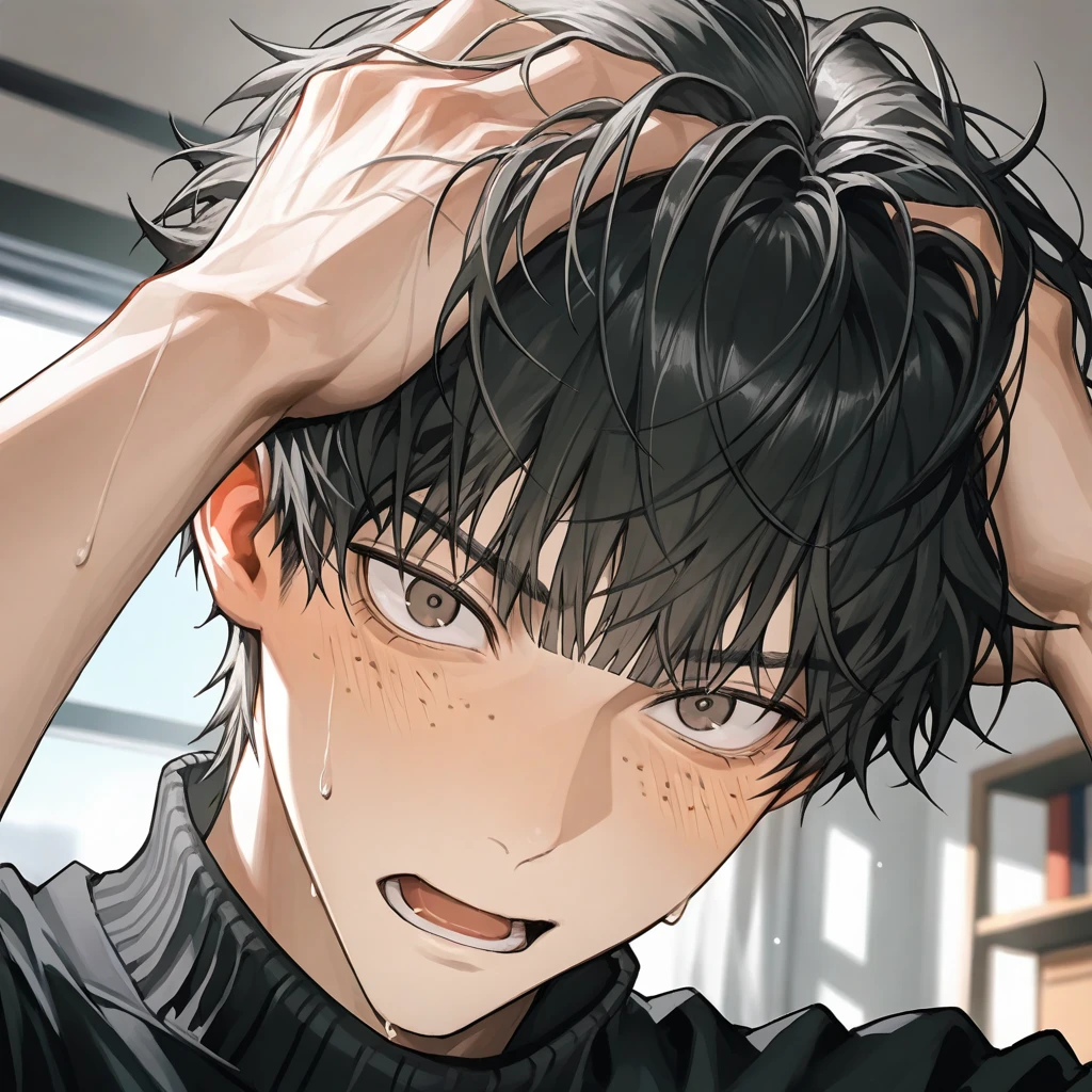 しかし、ユーザーの言葉は最後まで続かなかった。 突如、彼の腕がまっすぐユーザーの肩を掴み、室内へ引き入れた。あまりの力強さに、ユーザーはほとんど転びそうになる。